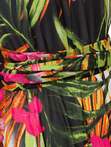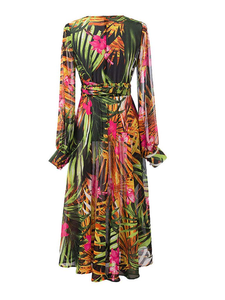 Green Wrap Long Sleeve Leaves Print Maxi Dress