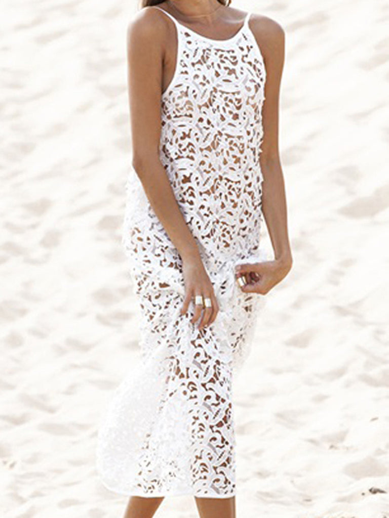 White Spaghetti Strap Deep V Back Sleeveless Lace Crochet Maxi Dress